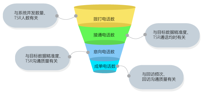 针对大量陌生客户数据,可以由系统自动先接通客户方之后,再接通坐席方,以提高TSR效率;而对于意向客户数据,宜先接通坐席方,再接通客户方;对于老客户,应由坐席人工控制,通过点击外呼,逐一回访。