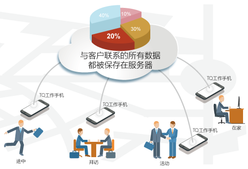 为员工配置工作手机和工作用手机号码。客户拨打工作手机号码以及员工通过工作手机联系客户时,工作手机自动形成电话记录和录音,并与服务器同步。