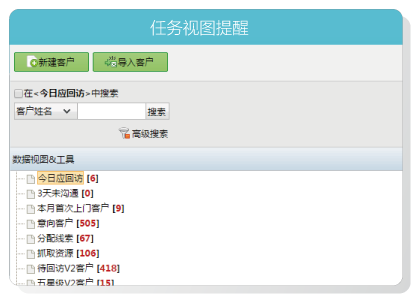 系统自动计算出符合规则的客户数,业务员登录系统后,查看任务视图列表,提醒业务员完成对应任务。部门经理可以查看成员任务数据,每天只需检查每个任务显示余量,轻松管理客户联络工作。