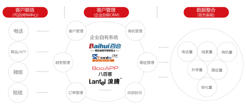 呼叫中心系统提供与客户沟通的系统、工具、流程、数据,企业自有第三方系统提供客户信息处理与存储。 将呼叫中心与第三方业务系统集成,客户来电时可提供客户信息,包括各种历史往来记录。并将沟通记录、业务记录及成单记录数据打通,形成“过程+结果”量化数据报表。
