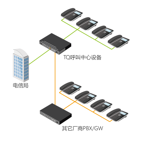 呼叫中心电话设备支持连接其它厂商的PBX,以及VOIP网关,在企业需要的情况下,实现无缝整合。并且,可控制业务相关的坐席接入呼叫中心,其他人员电话线路保持不变。